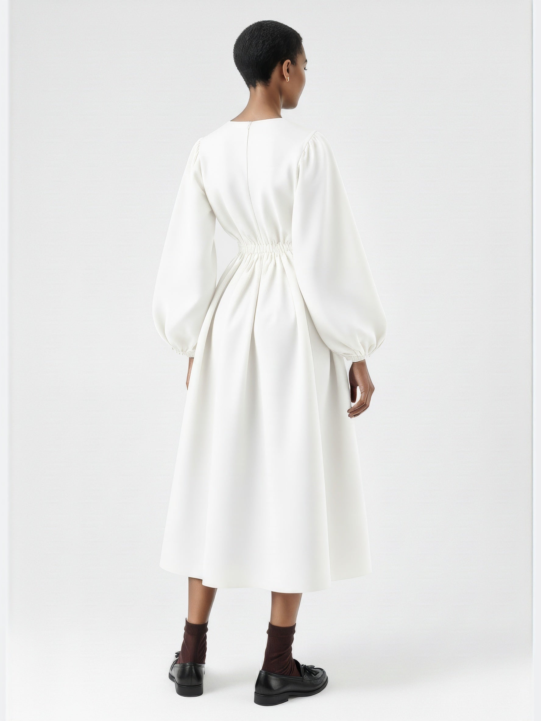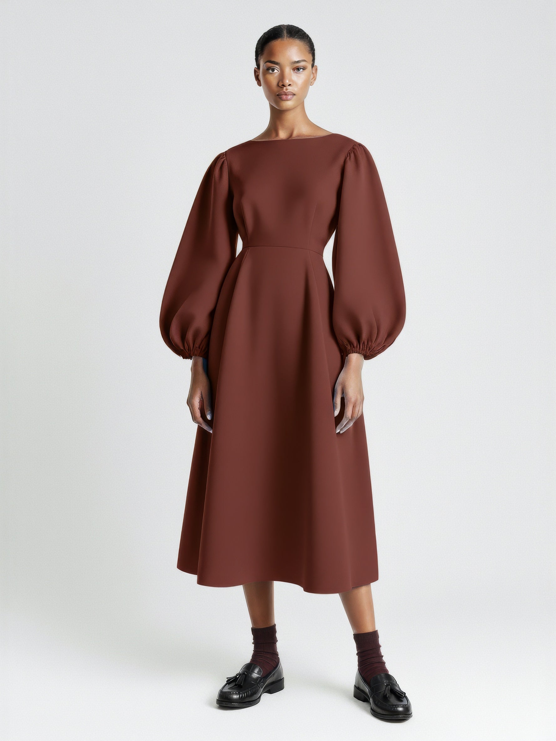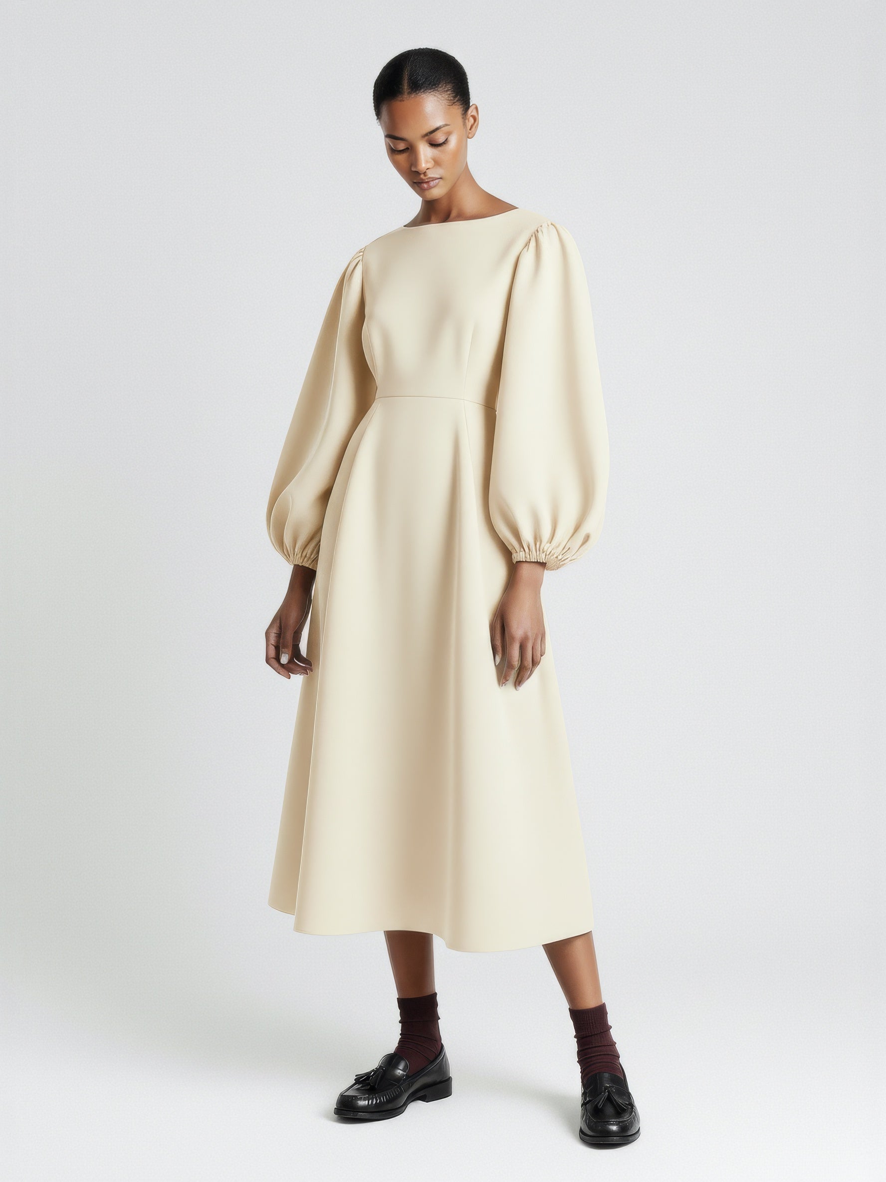 A full-length dress defined by voluminous balloon sleeves and a softly structured silhouette. Designed with a clean bateau neckline, gathered cuffs, and an elasticated back waist that adds gentle shape. The skirt falls in a subtle A-line for a balanced, sculptural look. Crafted from a developed cotton poplin.