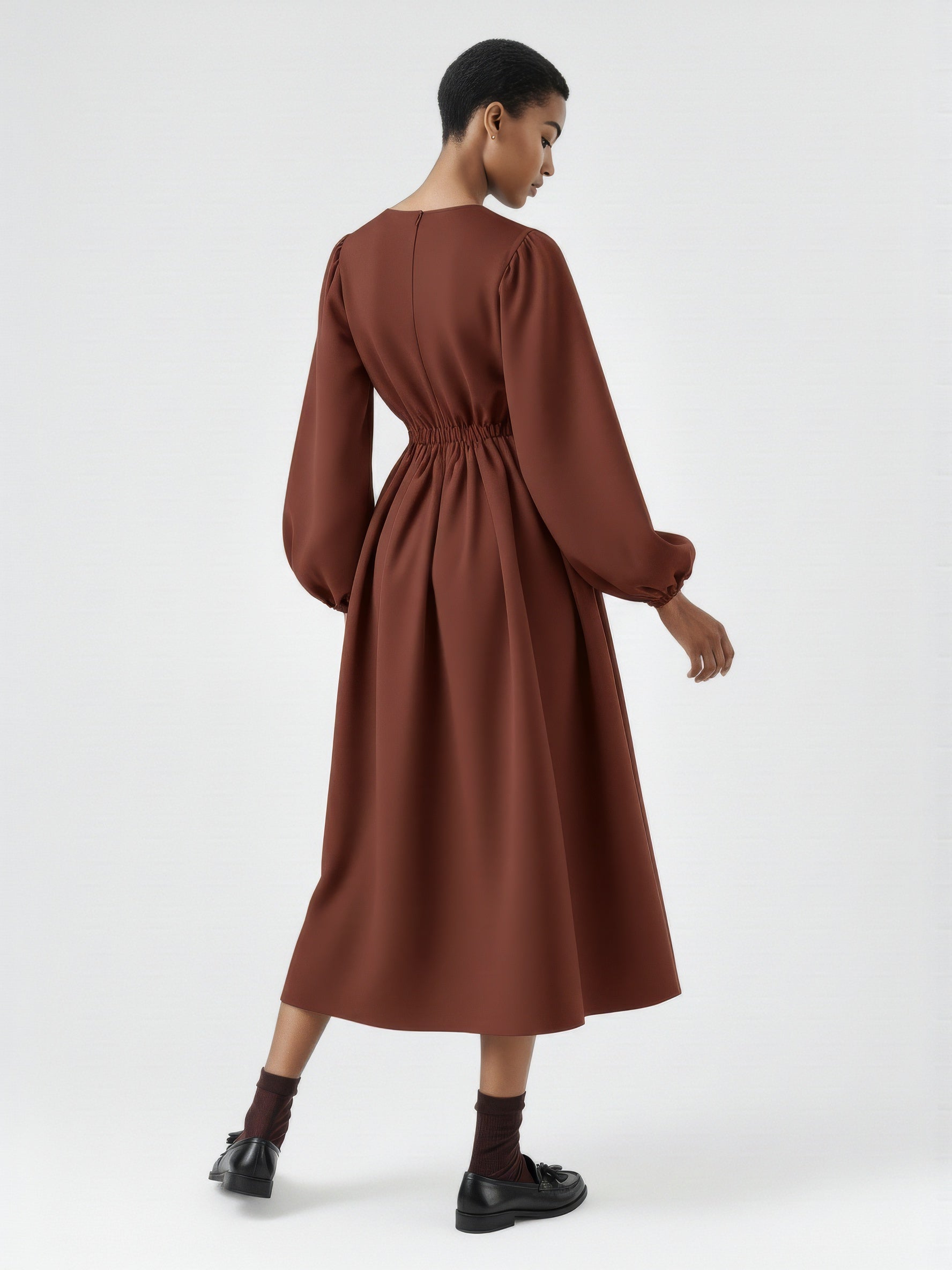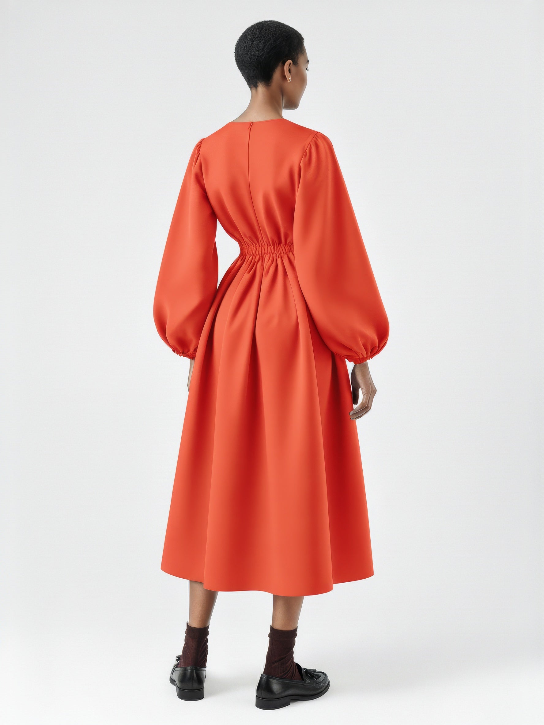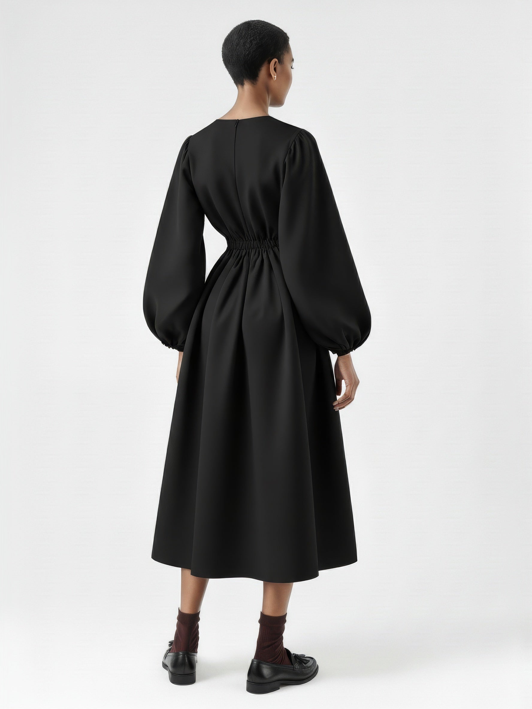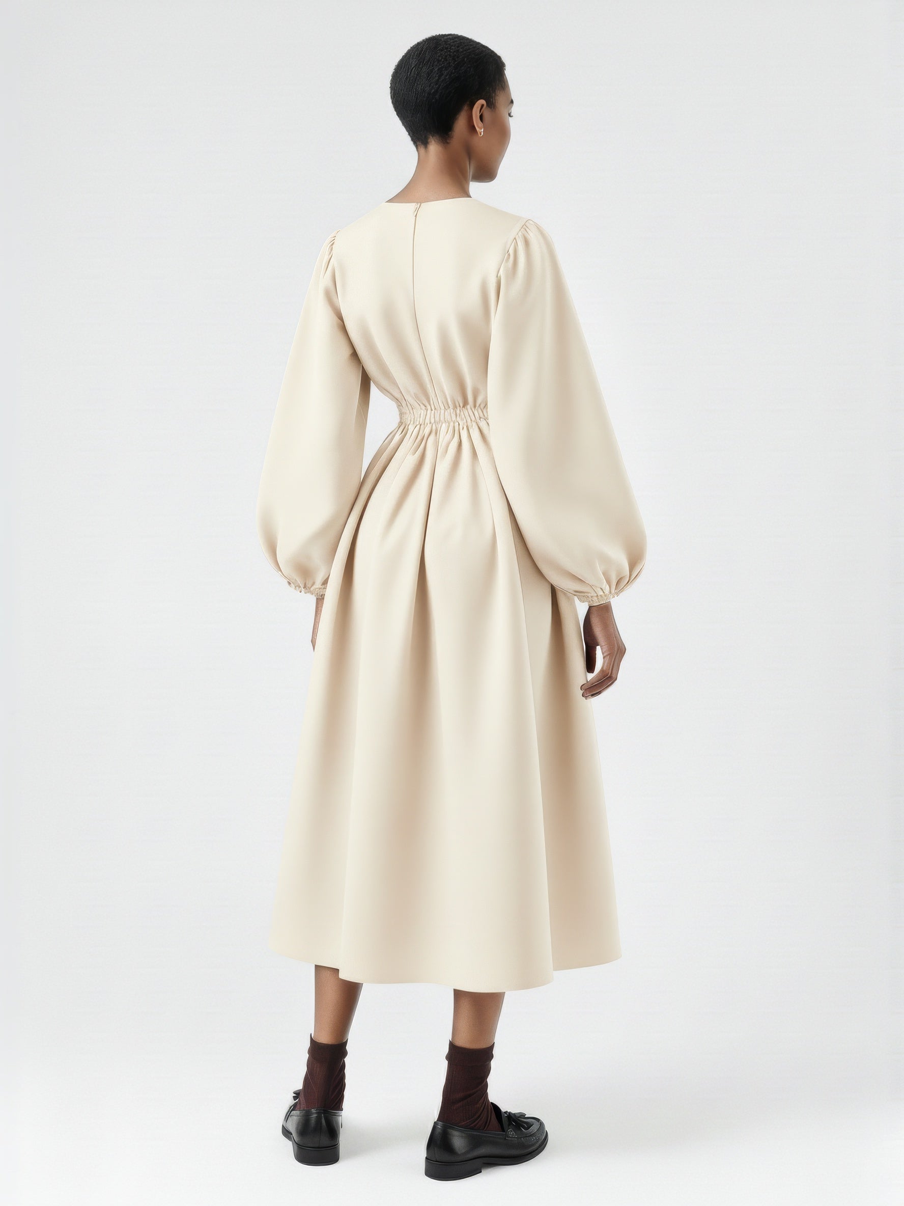 A full-length dress defined by voluminous balloon sleeves and a softly structured silhouette. Designed with a clean bateau neckline, gathered cuffs, and an elasticated back waist that adds gentle shape. The skirt falls in a subtle A-line for a balanced, sculptural look. Crafted from a developed cotton poplin.