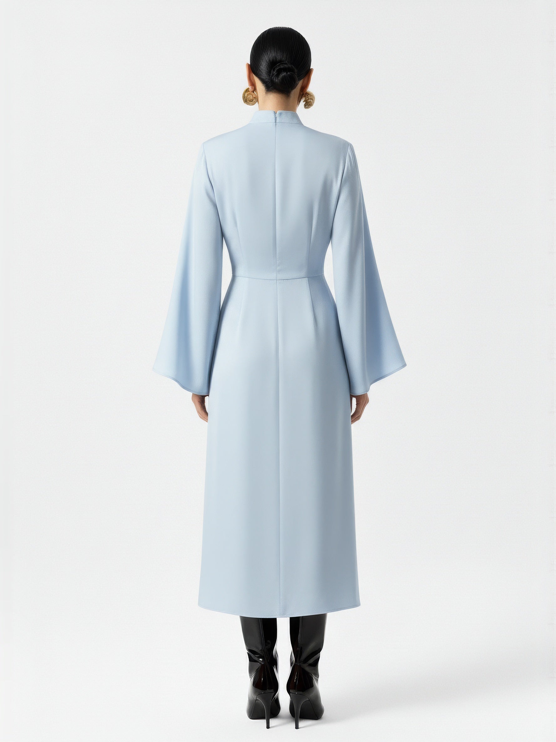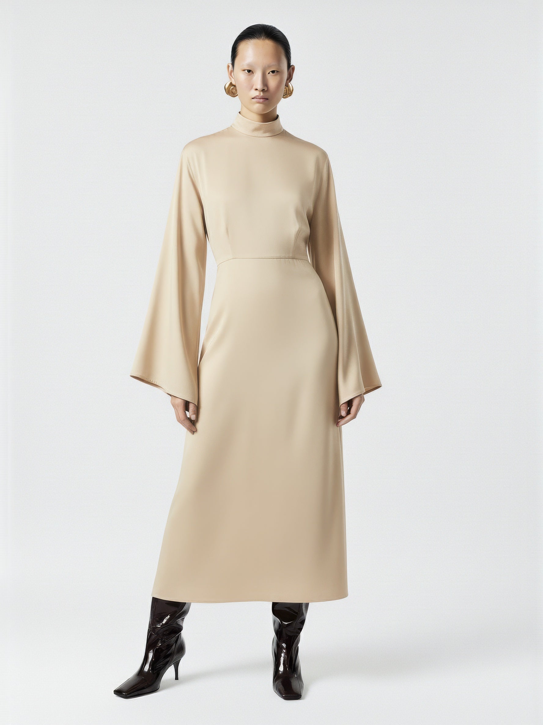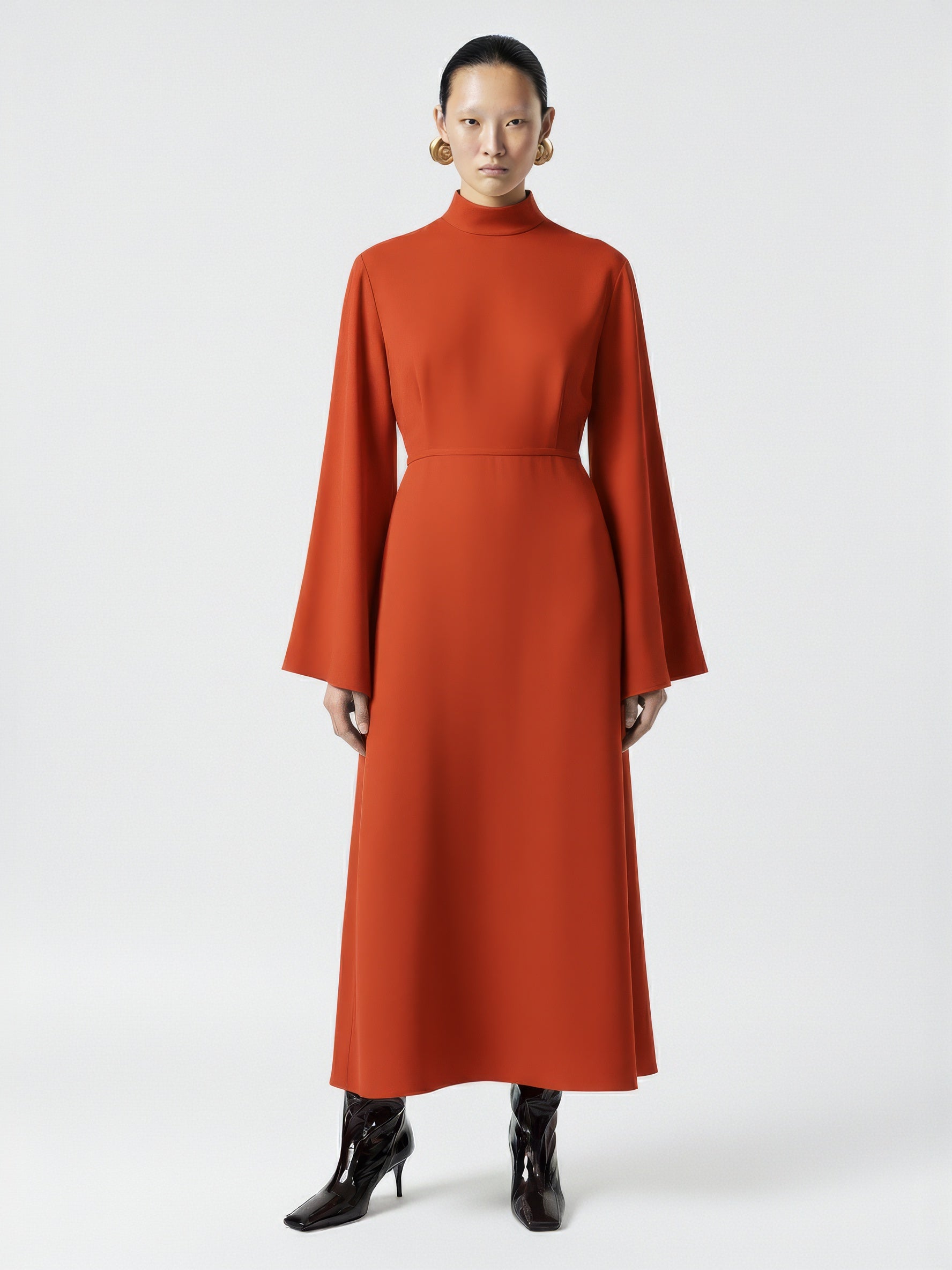 A high-neck dress with dramatic flared sleeves and a soft, elongated silhouette. Designed with a relaxed bodice, gentle waist shaping, and a clean back zip closure. The mid-calf length hem and sculptural volume through the sleeves create a refined, statement look. Crafted from a developed viscose blend enriched with Ecovero™.