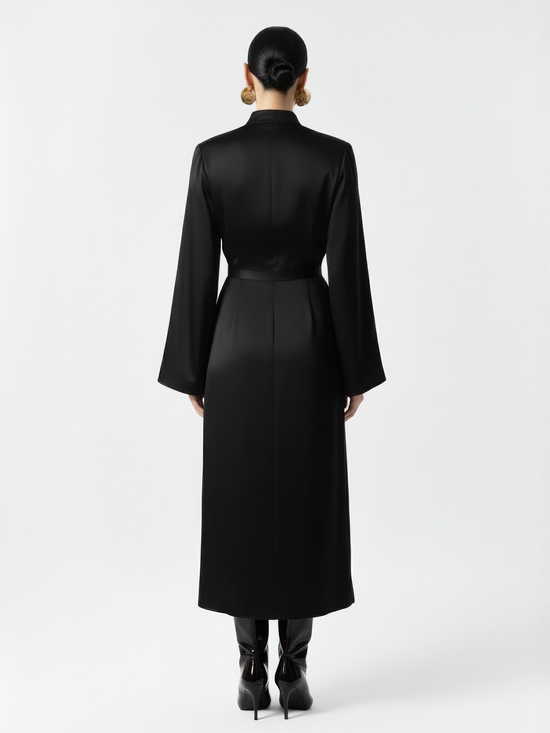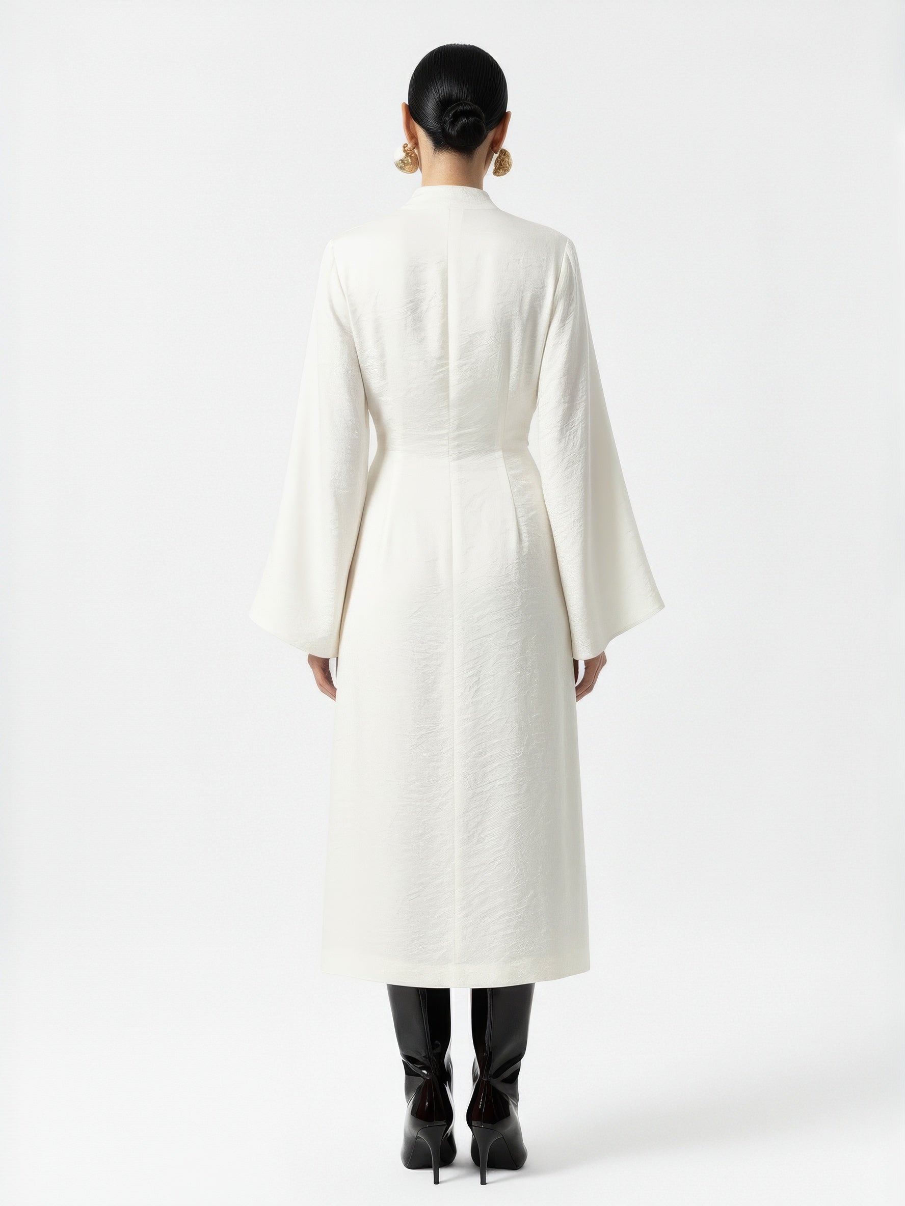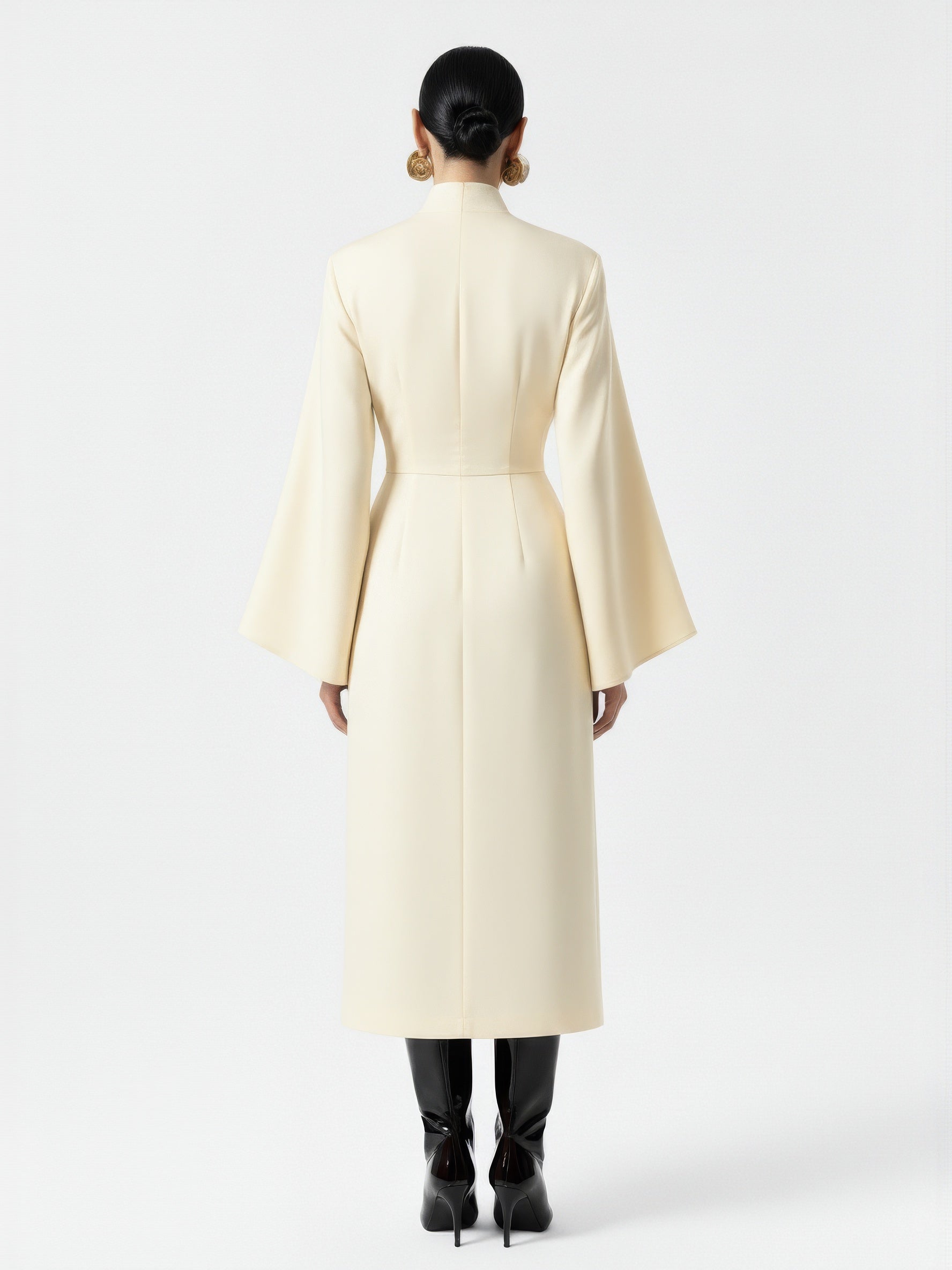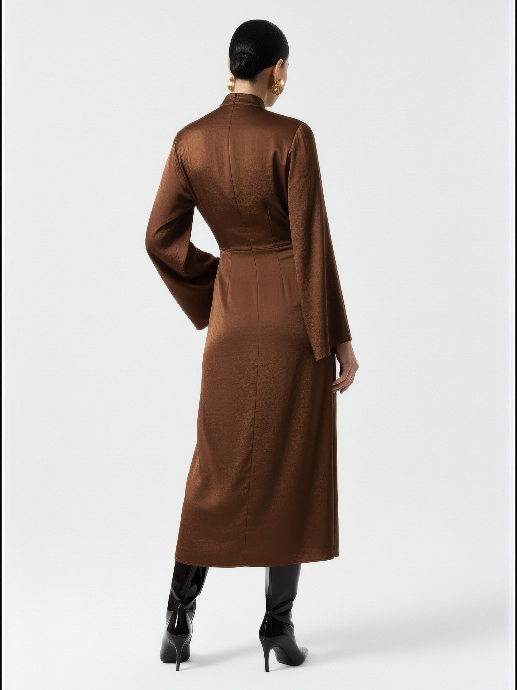 A high-neck dress with dramatic flared sleeves and a soft, elongated silhouette. Designed with a relaxed bodice, gentle waist shaping, and a clean back zip closure. The mid-calf length hem and sculptural volume through the sleeves create a refined, statement look. Crafted from a developed viscose blend enriched with Ecovero™.