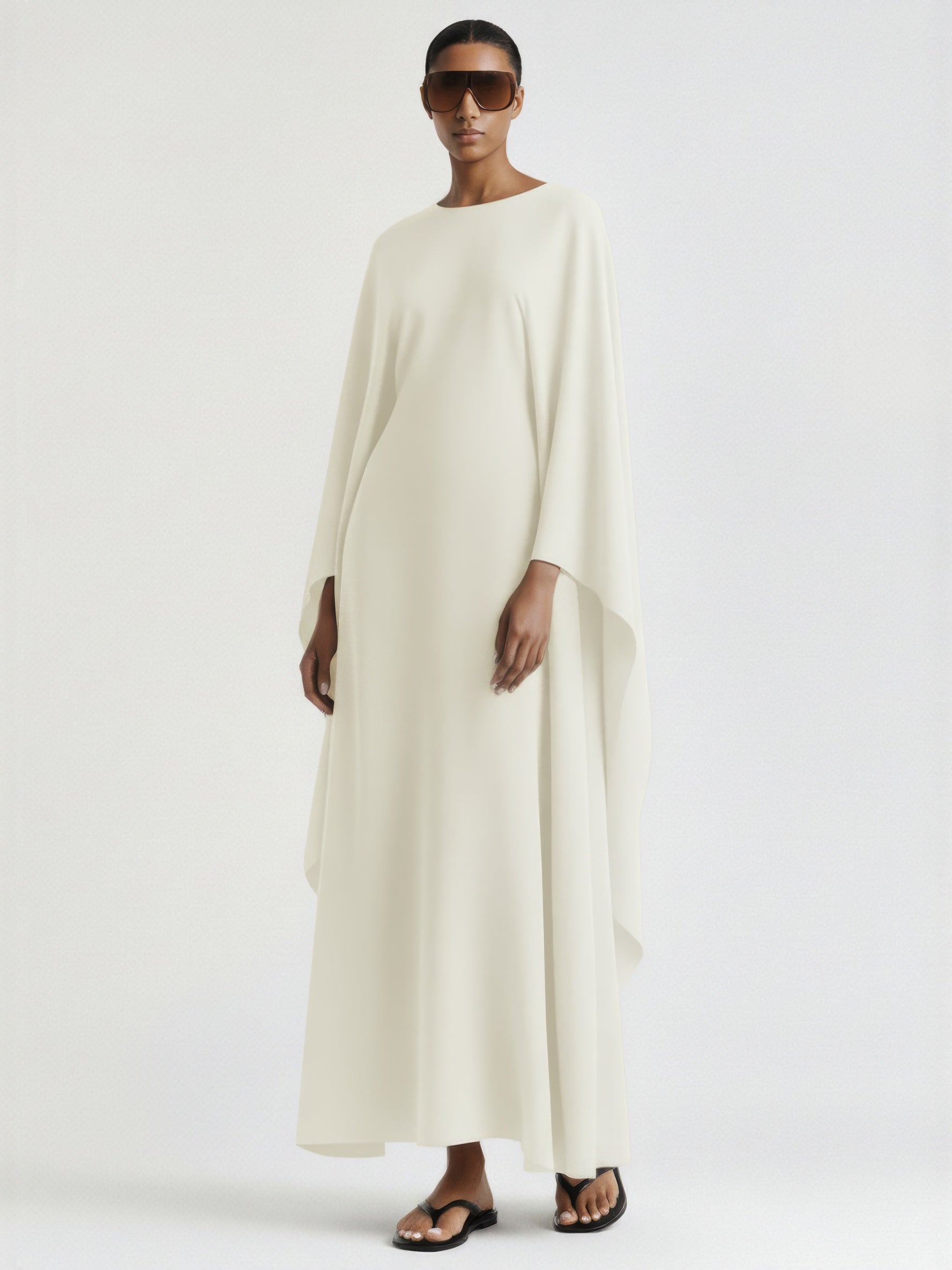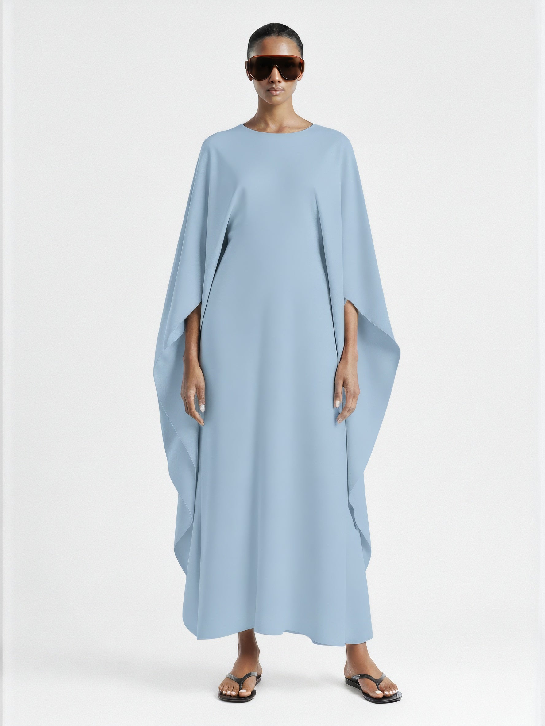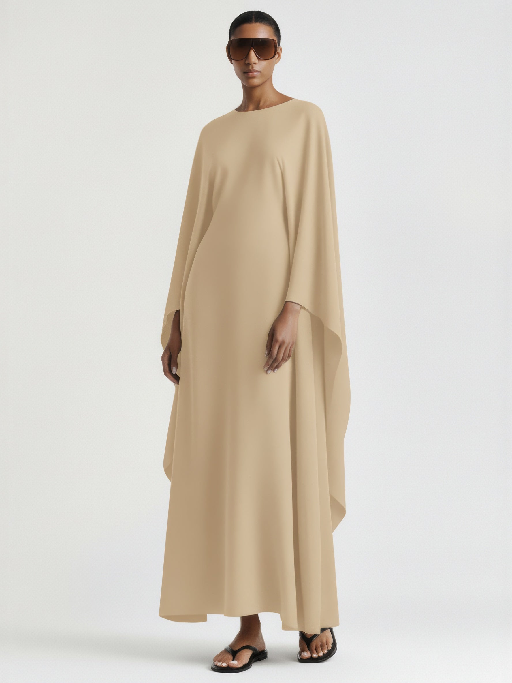 A cape sleeve dress with a fluid, floor-length silhouette and soft sculptural volume. Designed with a clean round neckline and draped, elongated sleeves that fall seamlessly from the shoulder. The back features a concealed zip closure for a minimal finish. Crafted from a developed viscose blend enriched with Ecovero™.