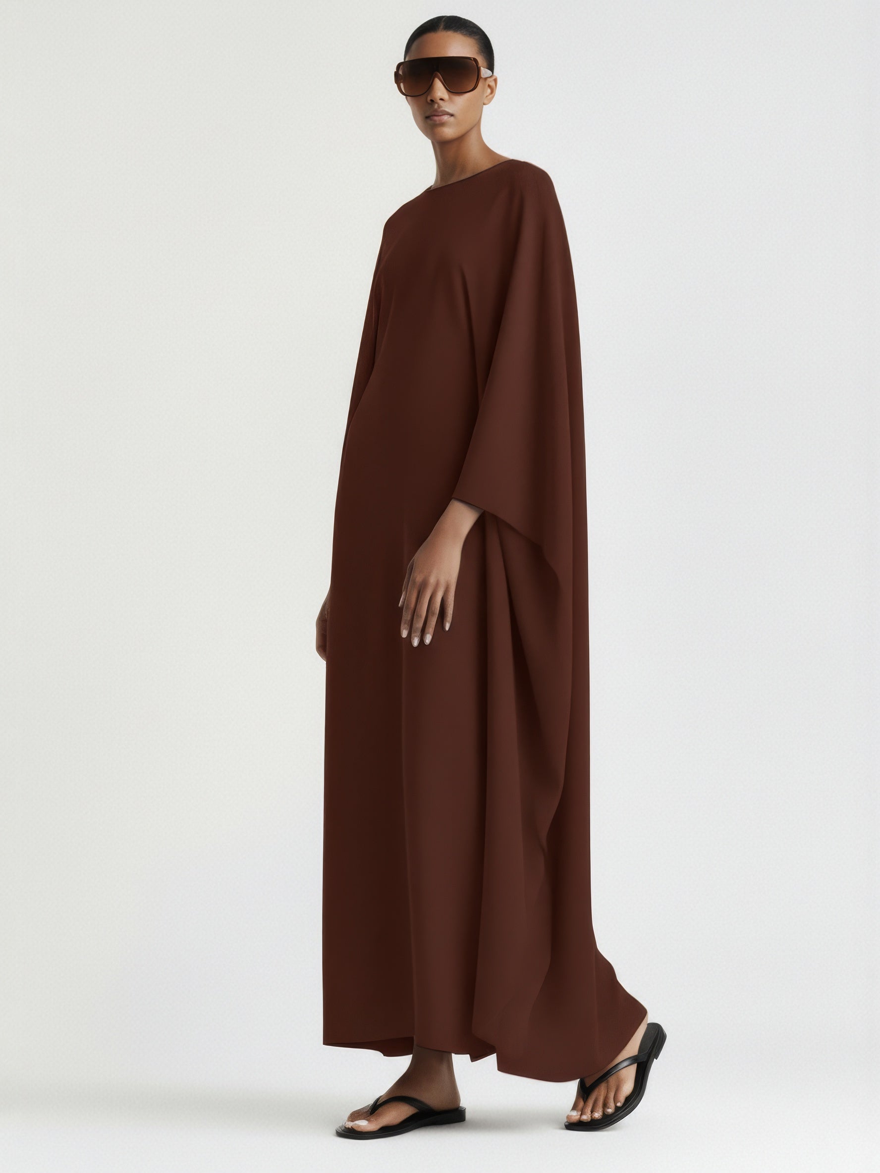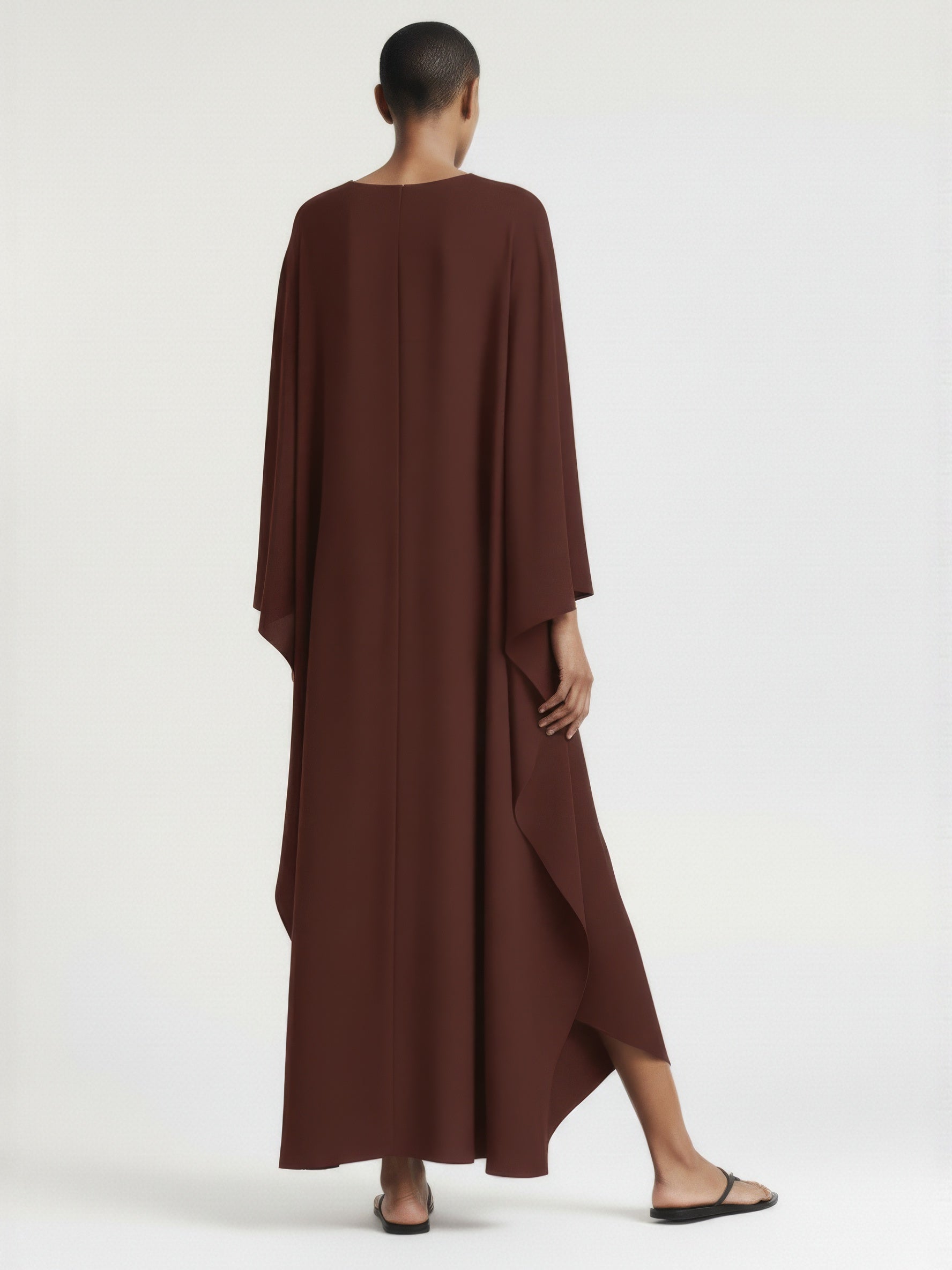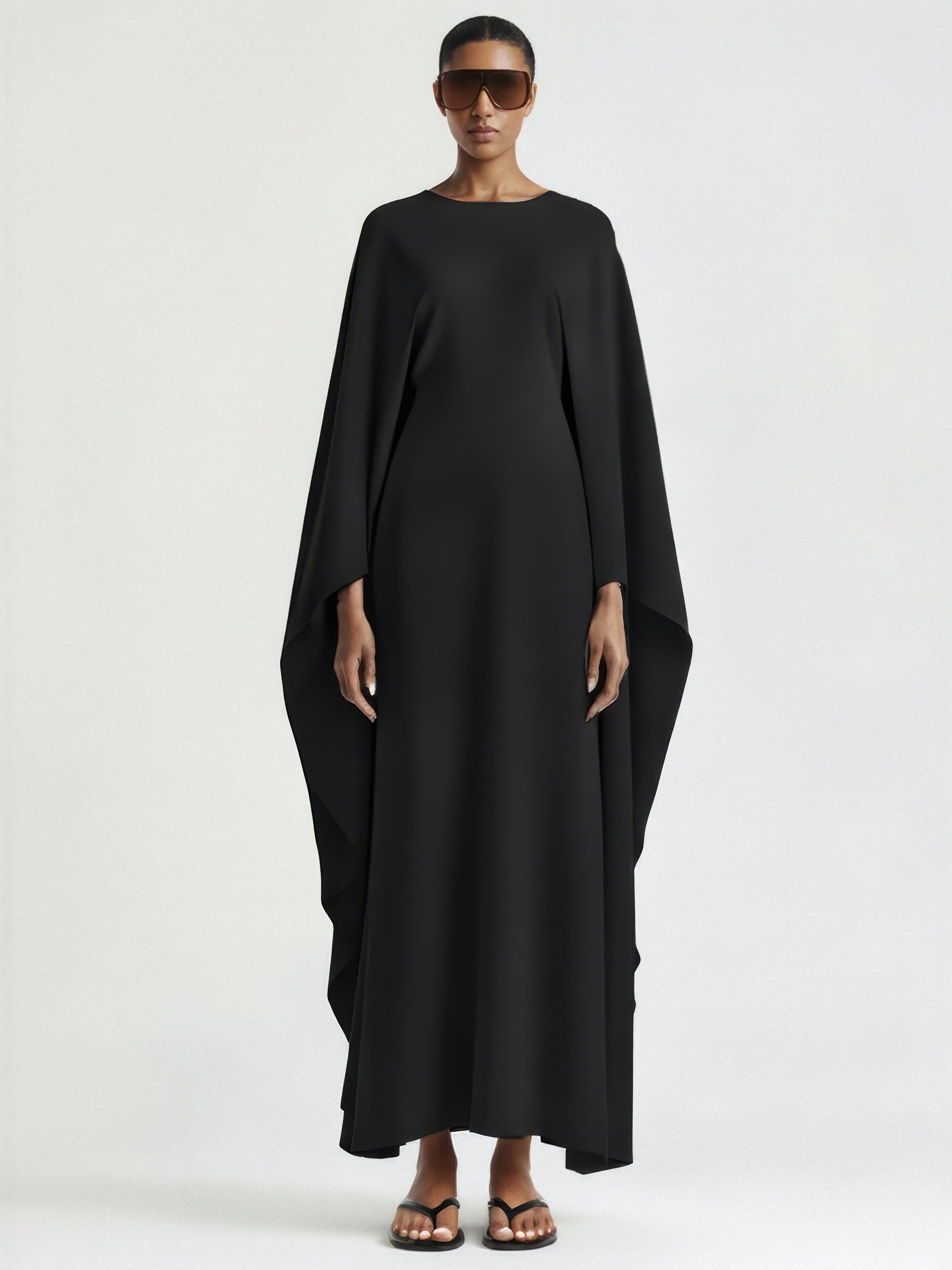 A cape sleeve dress with a fluid, floor-length silhouette and soft sculptural volume. Designed with a clean round neckline and draped, elongated sleeves that fall seamlessly from the shoulder. The back features a concealed zip closure for a minimal finish. Crafted from a developed viscose blend enriched with Ecovero™.