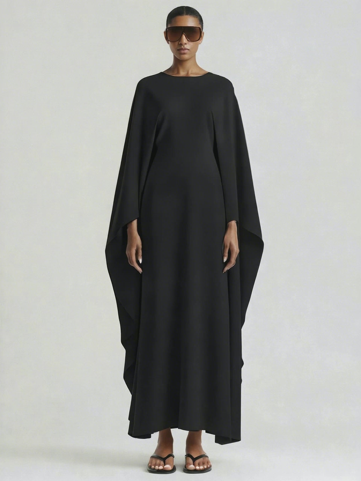 A cape sleeve dress with a fluid, floor-length silhouette and soft sculptural volume. Designed with a clean round neckline and draped, elongated sleeves that fall seamlessly from the shoulder. The back features a concealed zip closure for a minimal finish. Crafted from a developed viscose blend enriched with Ecovero™.