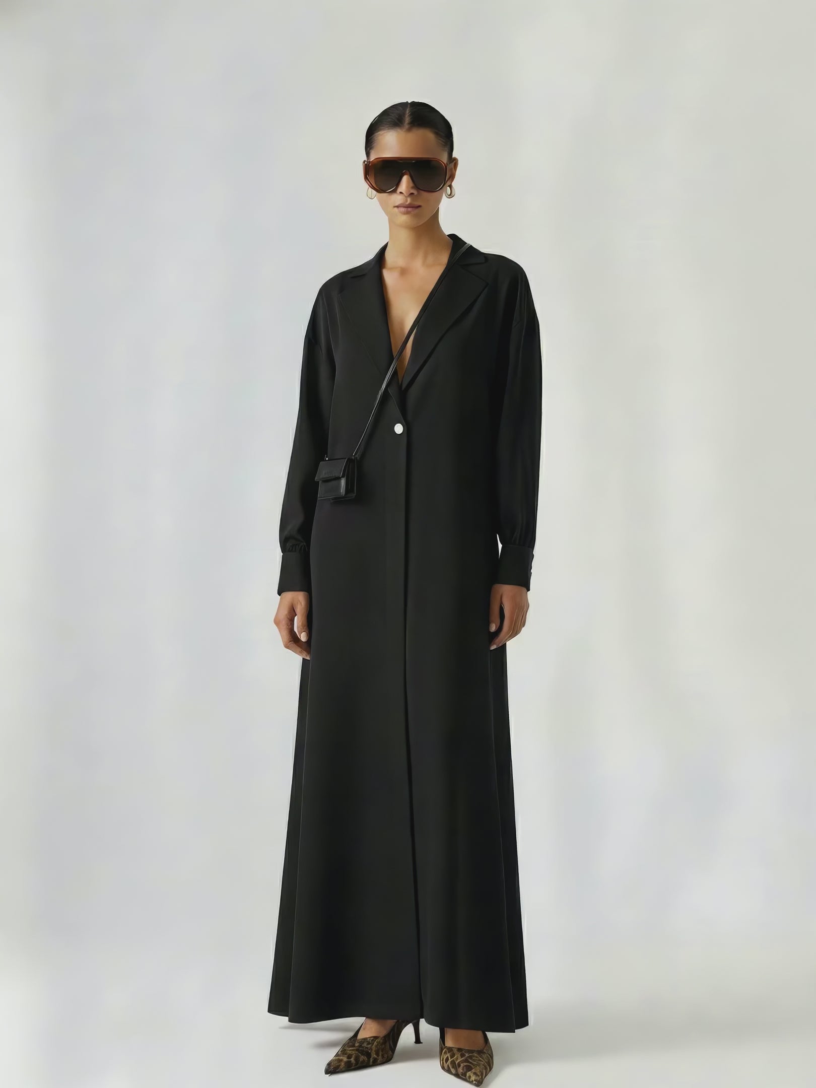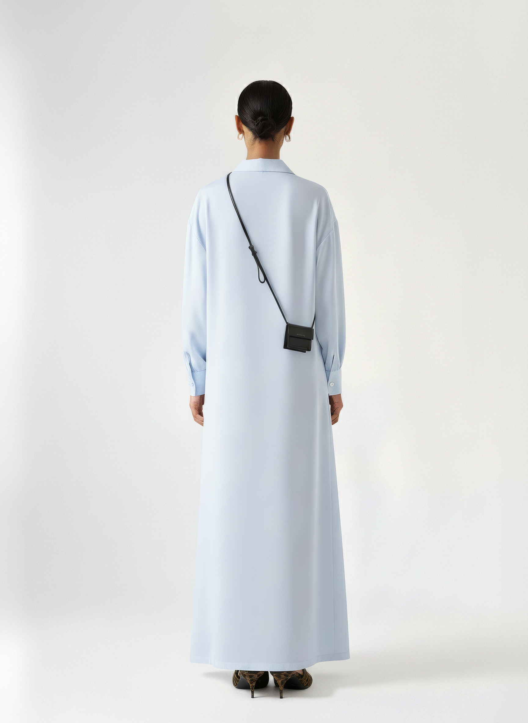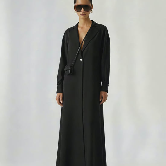 An oversized shirt dress with a structured collar and dropped shoulders. Designed with a deep lapel front, curved high-low hemline, and wide buttoned cuffs for a tailored finish. The single-button closure adds ease to the clean, minimal silhouette. The rest of the buttons are hidden buttons in the placket. Crafted from a developed viscose blend enriched with Ecovero™.
