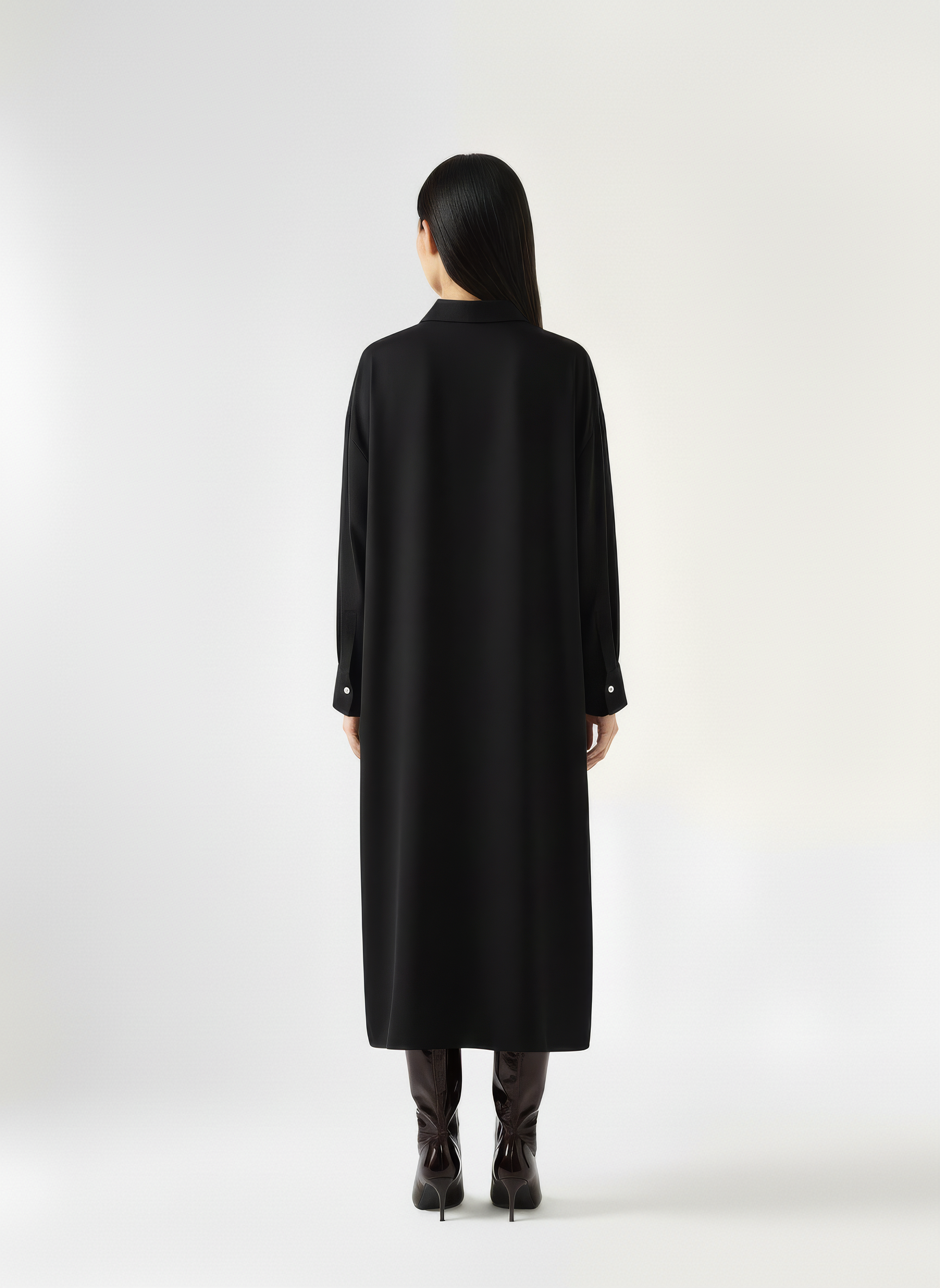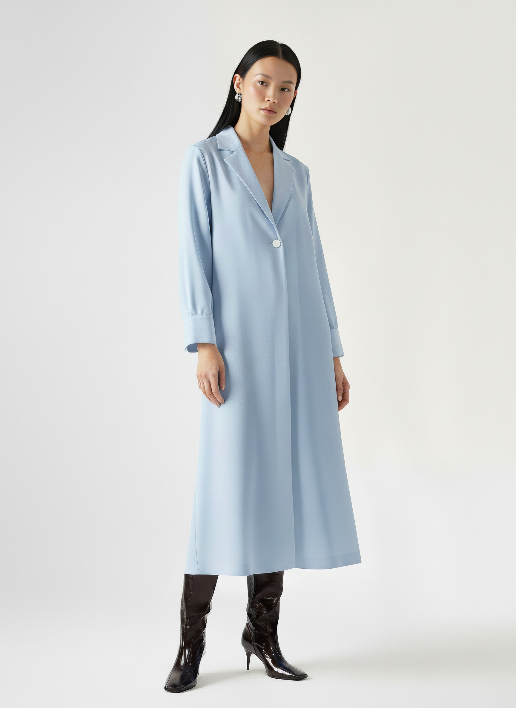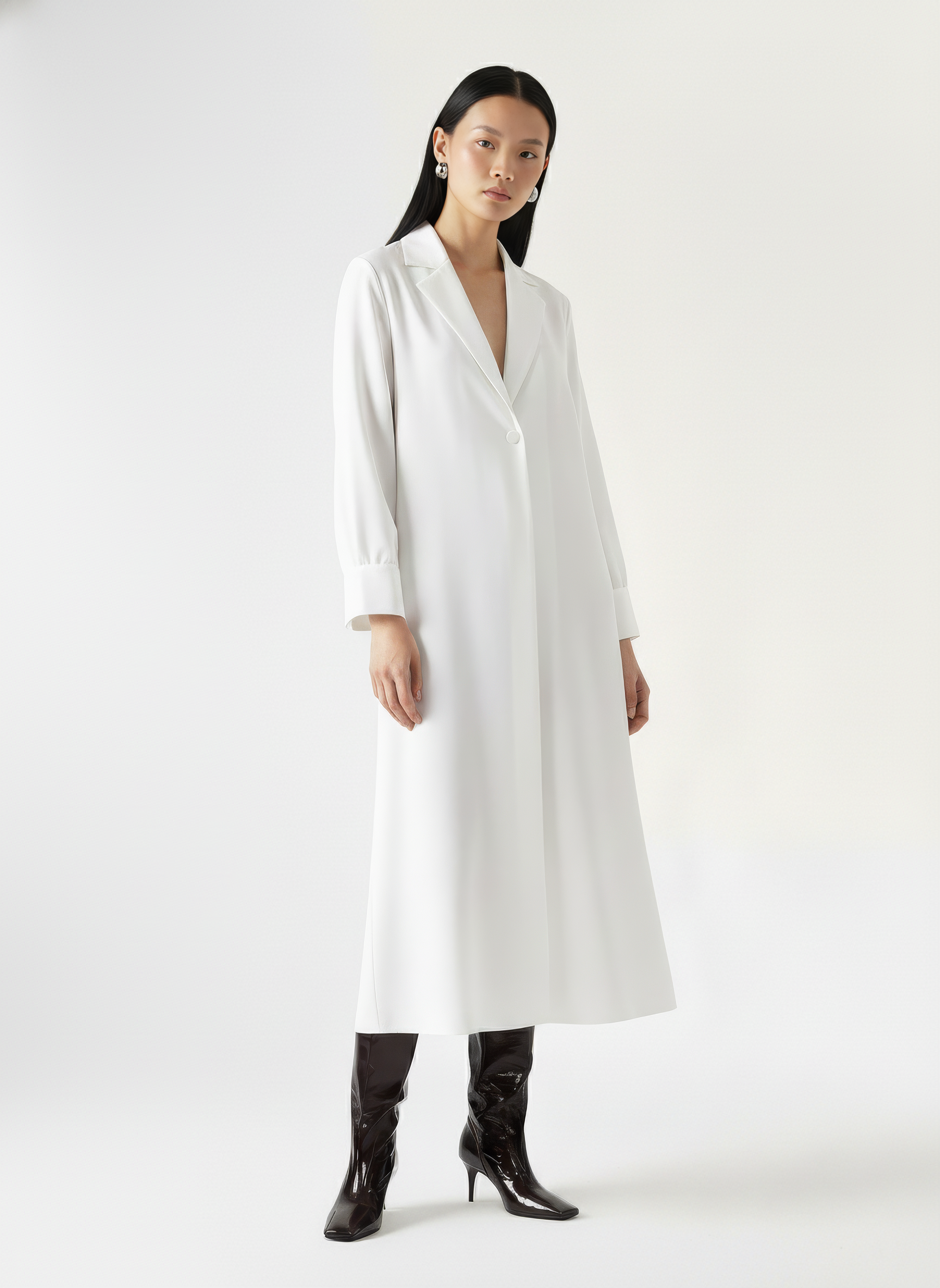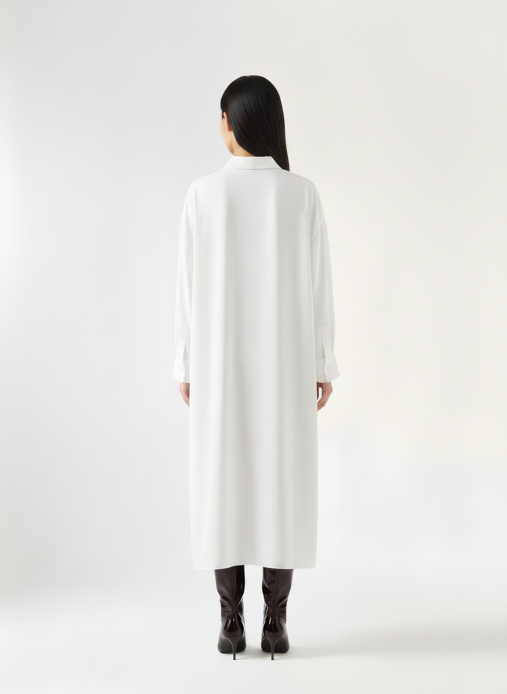 An oversized shirt dress with a structured collar and dropped shoulders. Designed with a deep lapel front, curved high-low hemline, and wide buttoned cuffs for a tailored finish. The single-button closure adds ease to the clean, minimal silhouette. The rest of the buttons are hidden buttons in the placket. Crafted from a developed viscose blend enriched with Ecovero™.