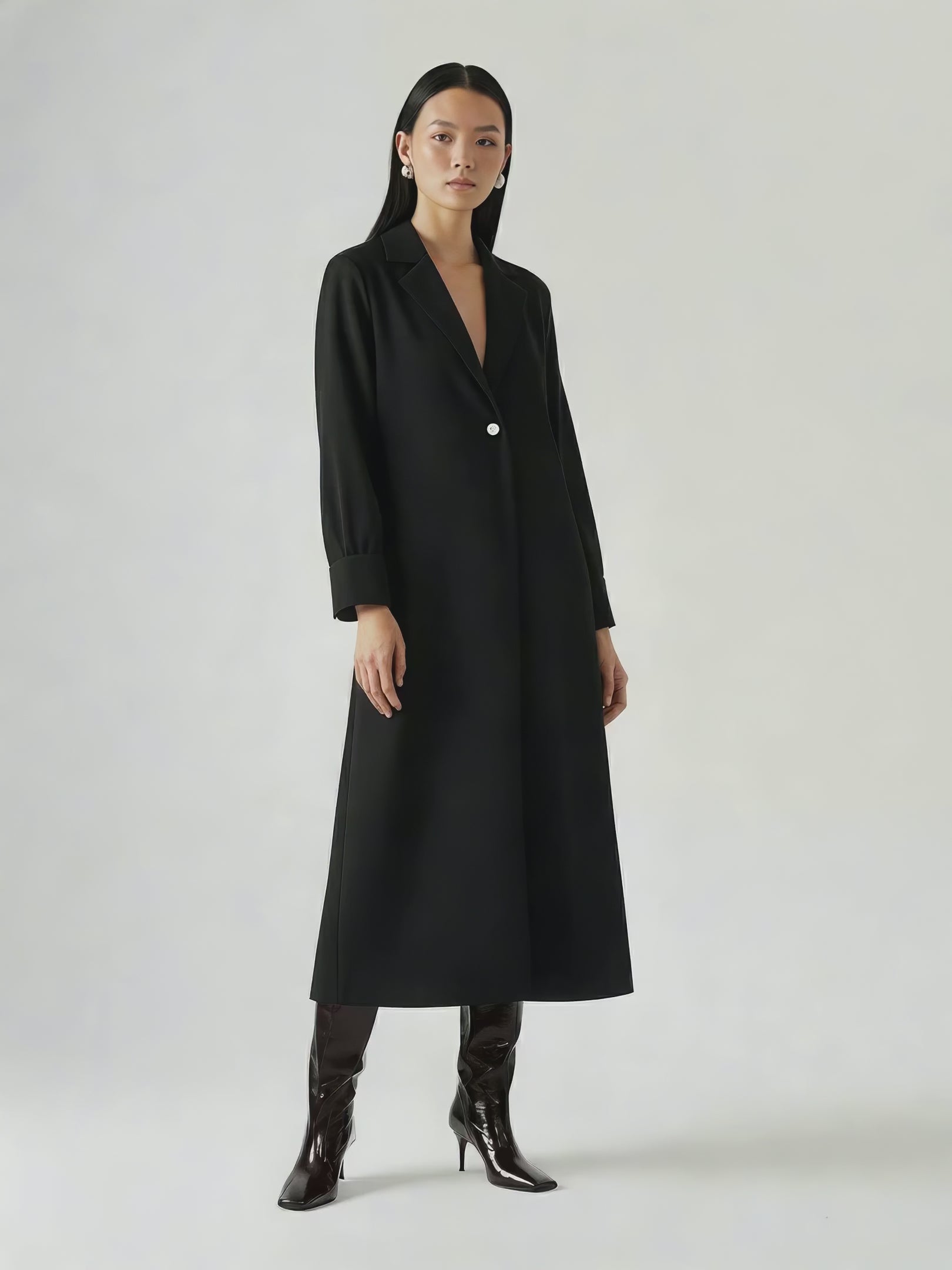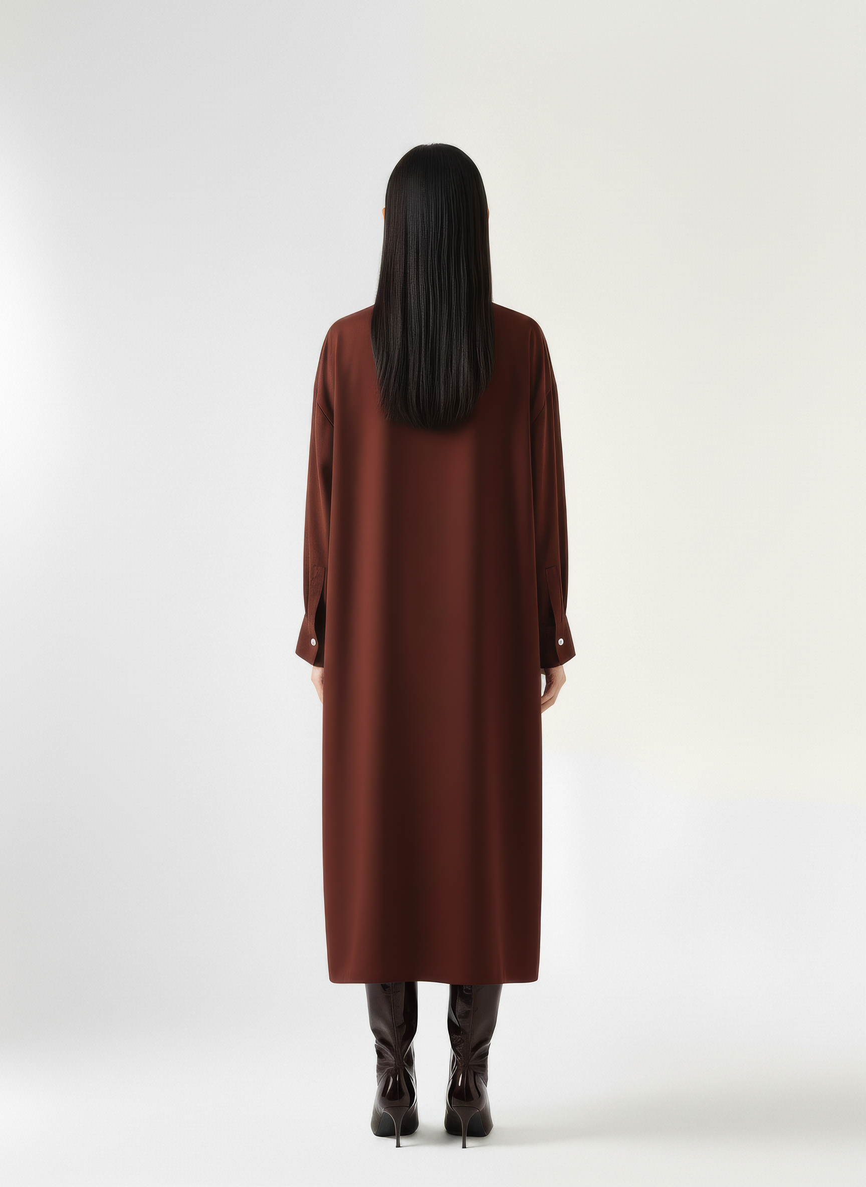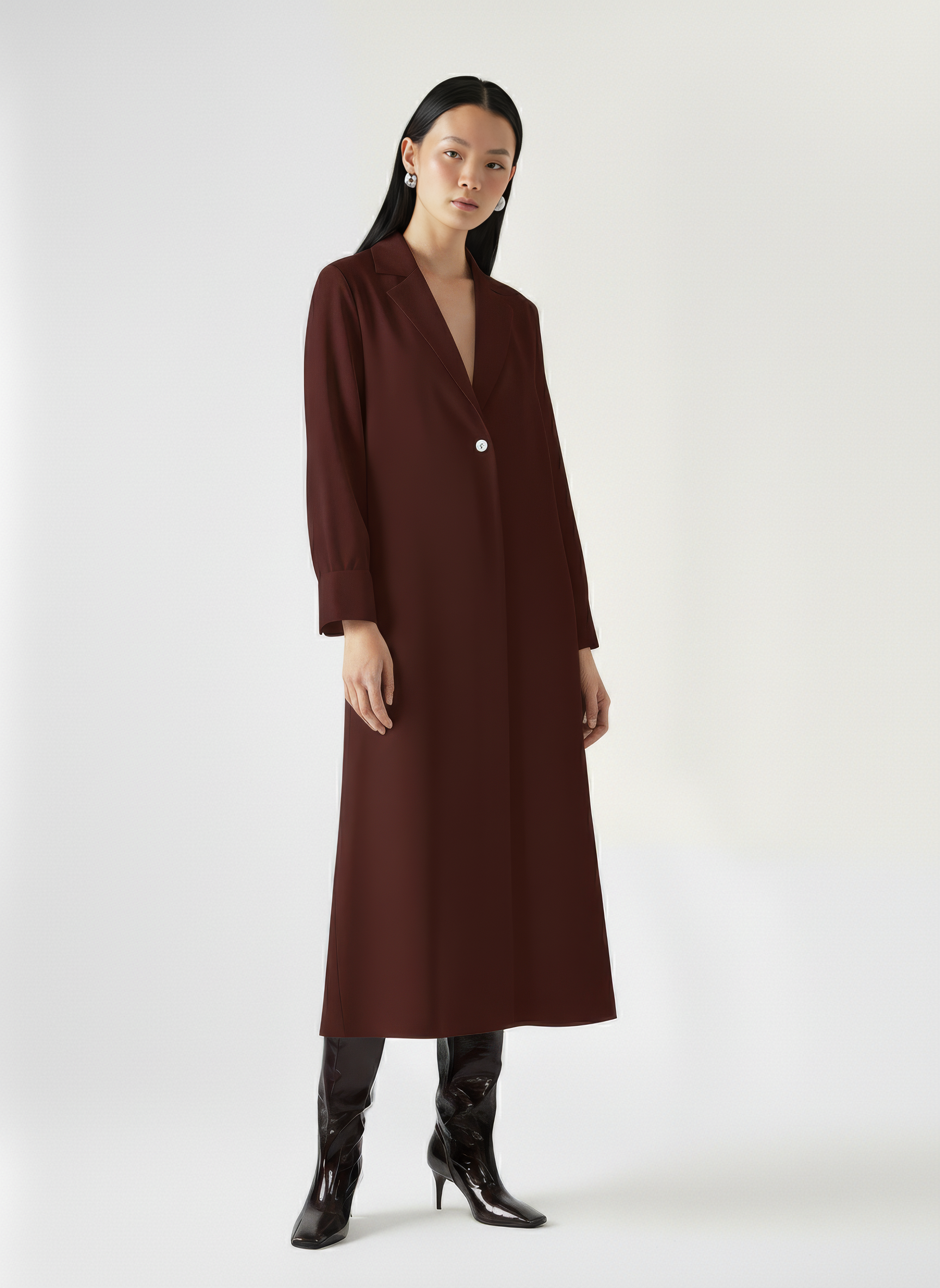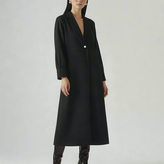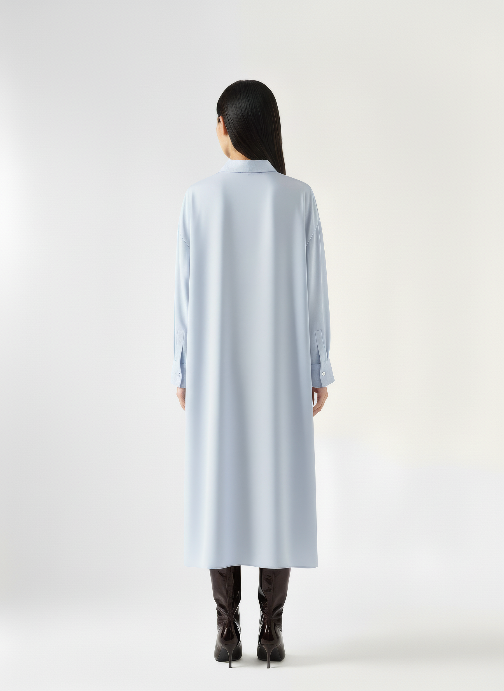 An oversized shirt dress with a structured collar and dropped shoulders. Designed with a deep lapel front, curved high-low hemline, and wide buttoned cuffs for a tailored finish. The single-button closure adds ease to the clean, minimal silhouette. The rest of the buttons are hidden buttons in the placket. Crafted from a developed viscose blend enriched with Ecovero™.