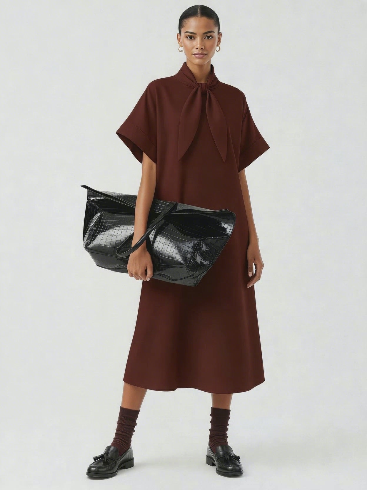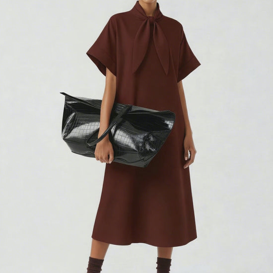 A tie-neck dress with a soft A-line shape and relaxed drape. Designed with wide sleeves, a clean collar, and an elongated tie detail at the neckline that can be styled loose or knotted. The silhouette falls to mid-calf with a smooth finish and easy movement. Crafted from a developed viscose blend enriched with Ecovero™.