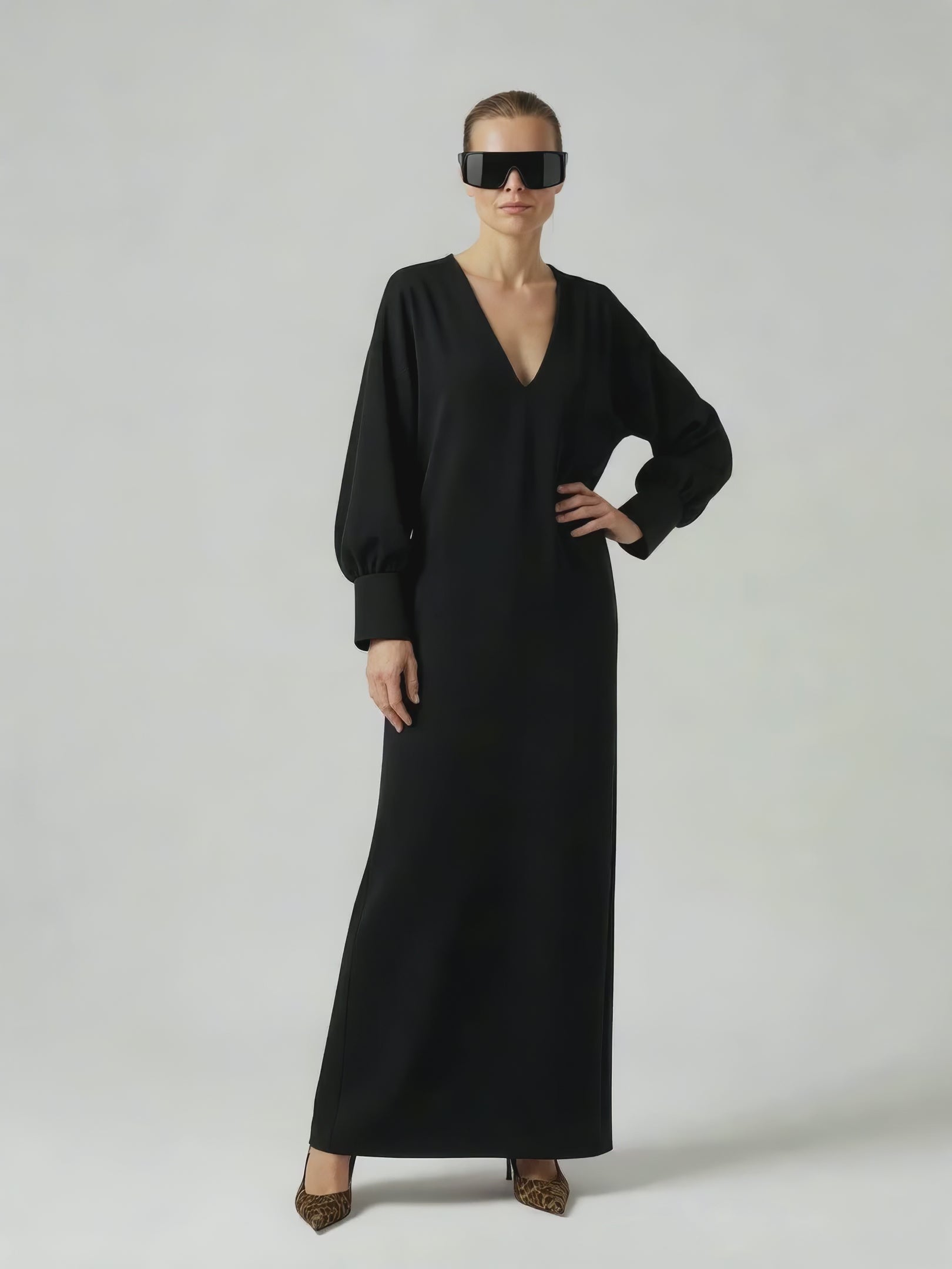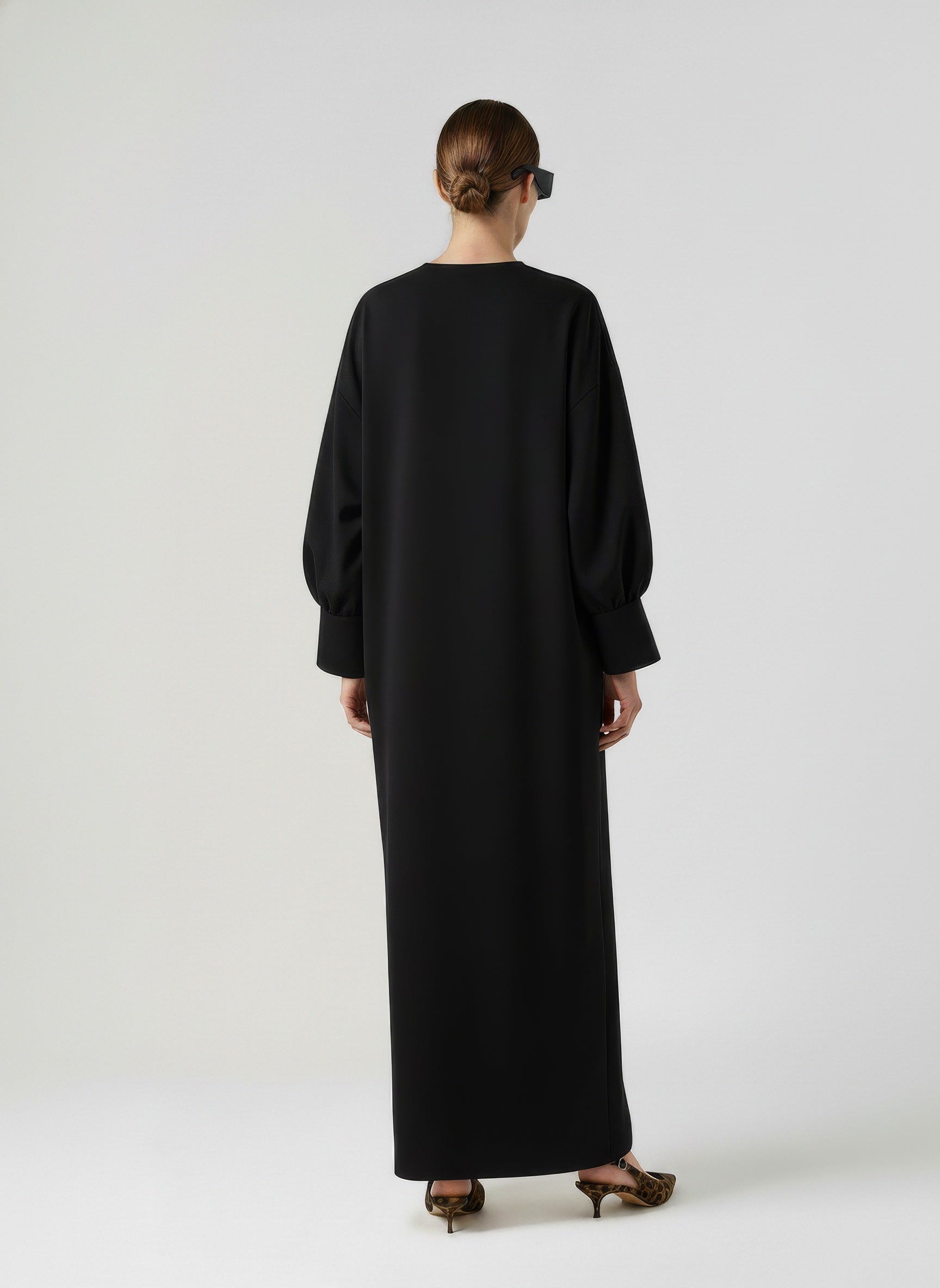 A straight-cut dress with a plunging V neckline and voluminous balloon sleeves. Designed with wide cuffs and a clean, silhouette with a slight curve in the back. Crafted from a developed viscose blend enriched with Ecovero™.